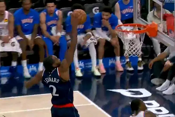 bob半岛体育官方入口-伦纳德抢断反击单臂滑翔劈扣拿19分,快船追至落后雷霆20分